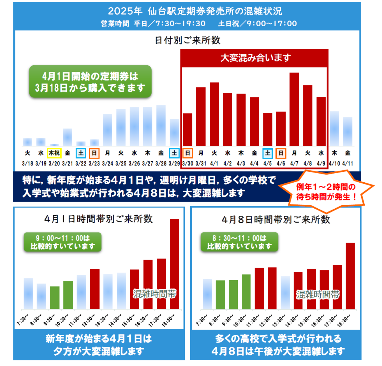 4月当初は定期券発売所の窓口が混雑します。特に4月8日前後の午後3時以降は、各学校 の入学式・始業式の後に定期券をお買い求めのお客様が集中し、泉中央駅・仙台駅・市バス 実沢営業所の窓口では、例年1~2時間の待ち時間が発生しています。 混雑を避けるためには入学式や始業式の前に定期券を購入するのがおすすめです!