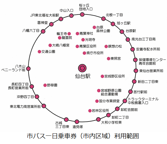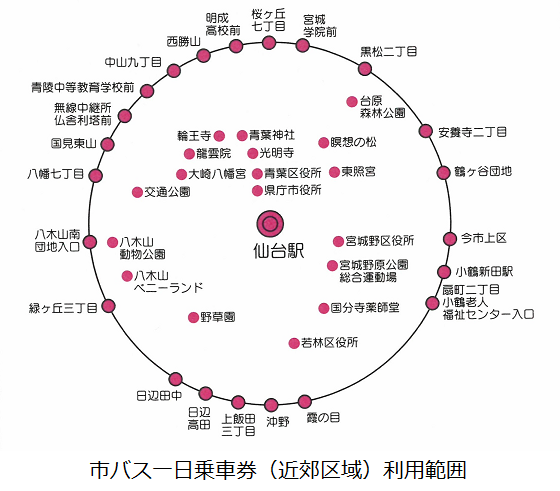 市バスの市内区域全線、近郊区域内全線を1日何回でも自由に乗り降りできます(るーぷる仙台と楽天シャトルバスでは利用できません)。バス車内での販売はしておりませんので事前に定期券発売所でご購入ください。