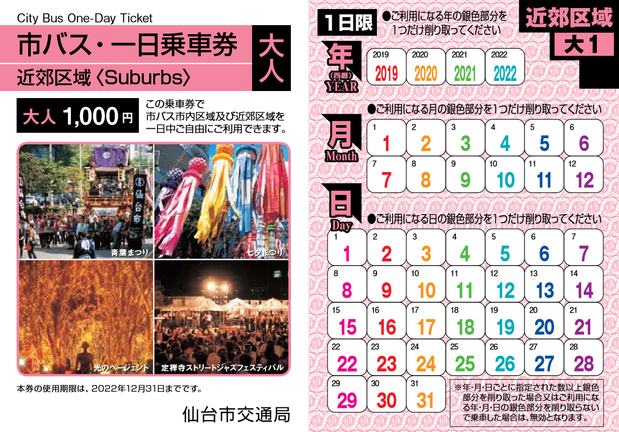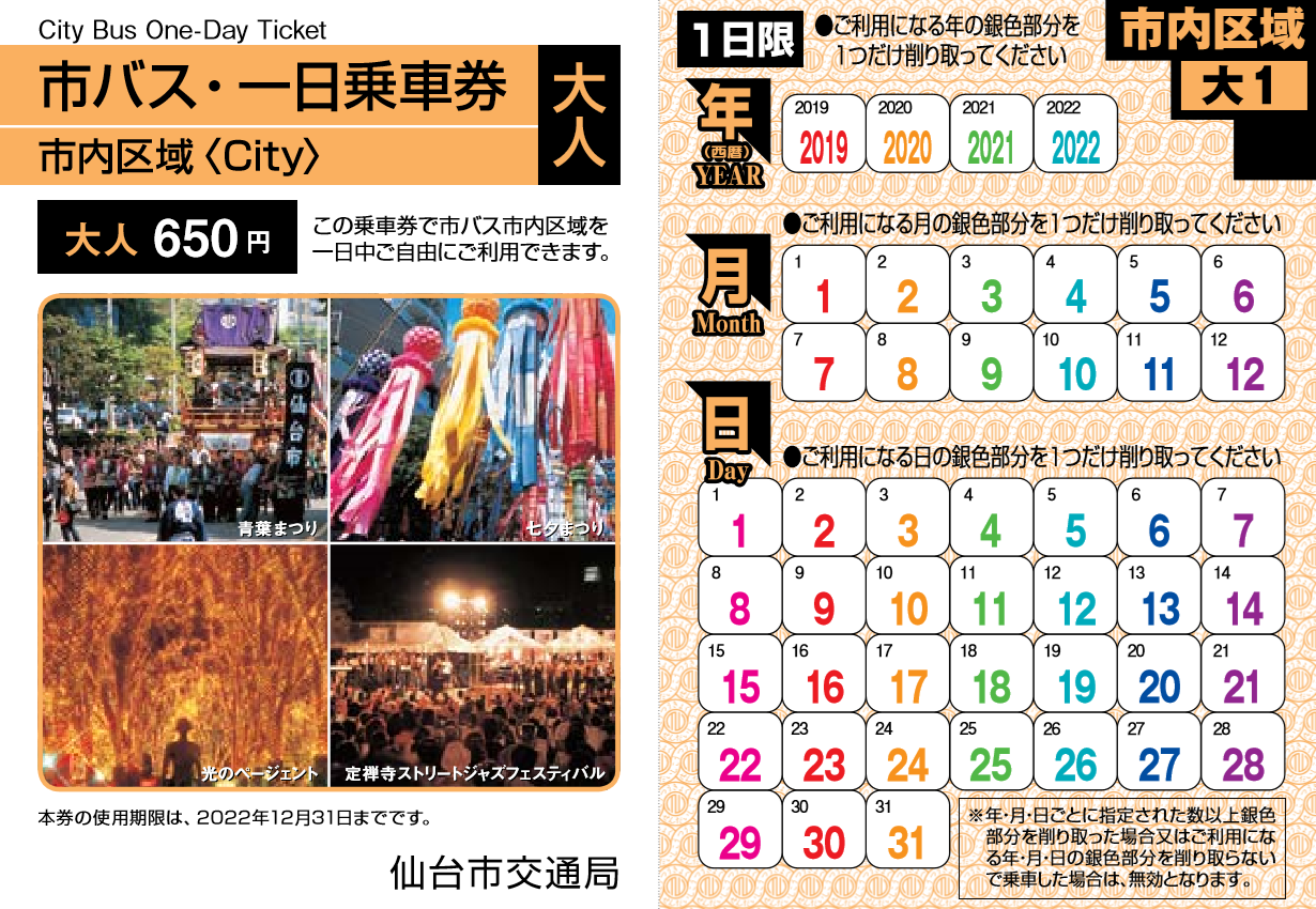 ・乗車日はシールをけずって決められます。 - 市内区域券(仙台駅から260円区間内全線通用)