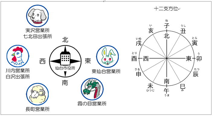バス営業所(当時は7営業所・5出張所ありました。)のある方角を、市役所を中心に十二支※の方位に当てはめて決めました。