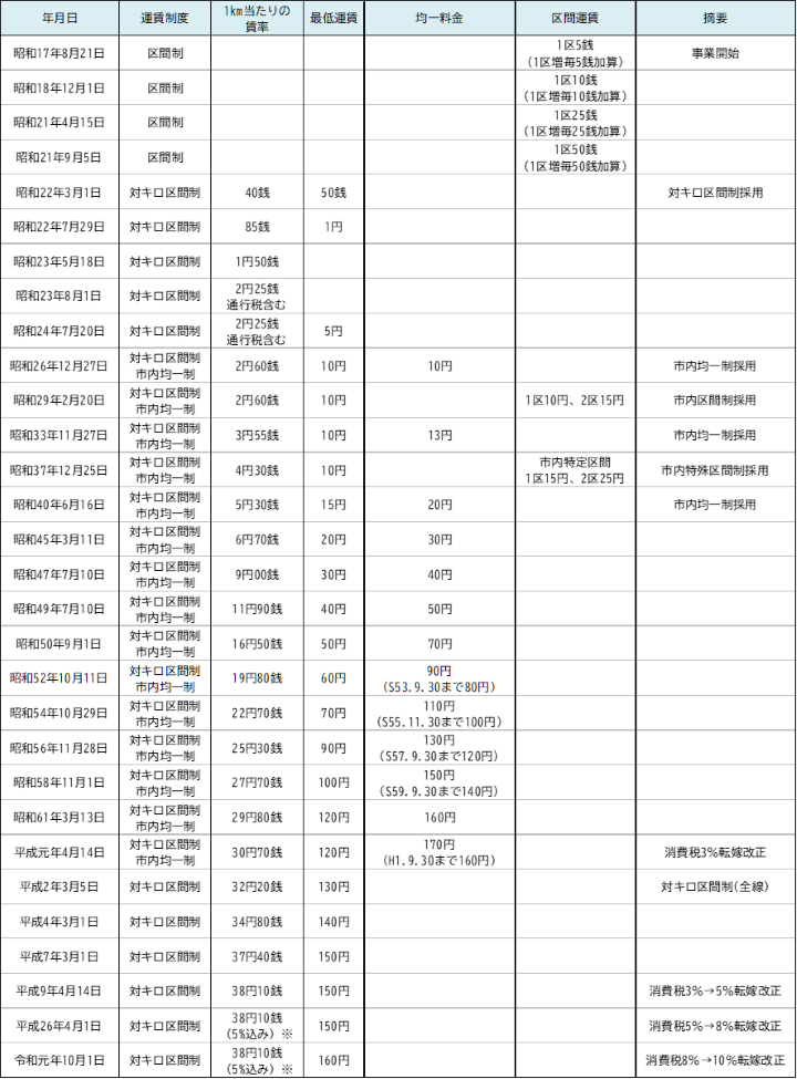 ※市バスの運賃は、消費税率5%時の賃率に距離等を乗じて計算した額に、さらに消費税率10%(令和元年9月30日までは8%)分を転嫁する計算を行うことで算出しています。