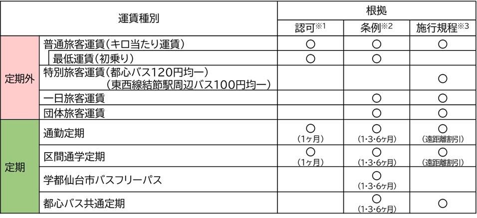 また、仙台市交通局は公営企業であり、市バスの運賃は地方自治法225条の「公の施設の使用料」に該当することから、同法228条1項により、運賃の金額等について、仙台市の条例でも定められています(仙台市乗合自動車運賃条例)。