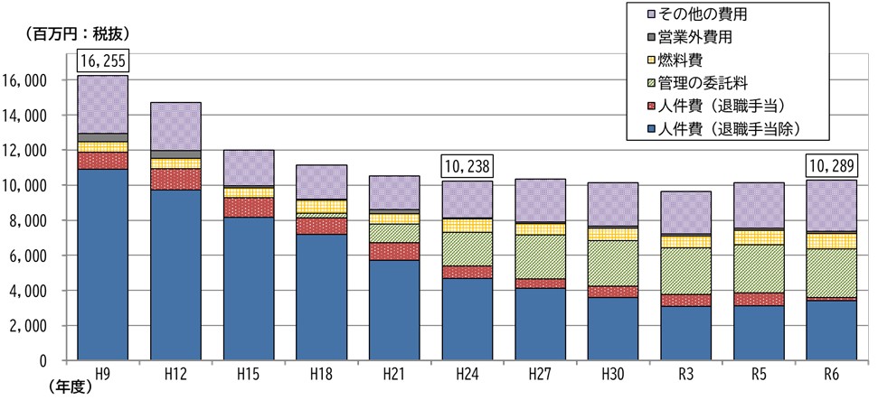 仙台市交通局では、これまで給料表の見直し(平成10年)やバス運転業務等の管理の委託をはじめとして、様々な経営効率化策に取り組んでおり、その結果、費用の多くを占めていた人件費を中心に、着実に費用削減が進んできました。しかしながら、経営努力による費用削減の余地は、すでに極めて少なくなっています。