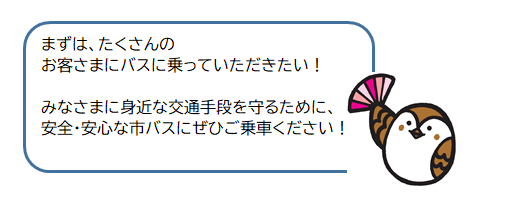 近年は、利用状況に応じた便数調整(減便)を行うことで、費用の削減に努めていますが、安全・安心で、お客さまにご利用いただきやすい市バスの運行を続けていくためには、費用削減には限度があるものと考えています。