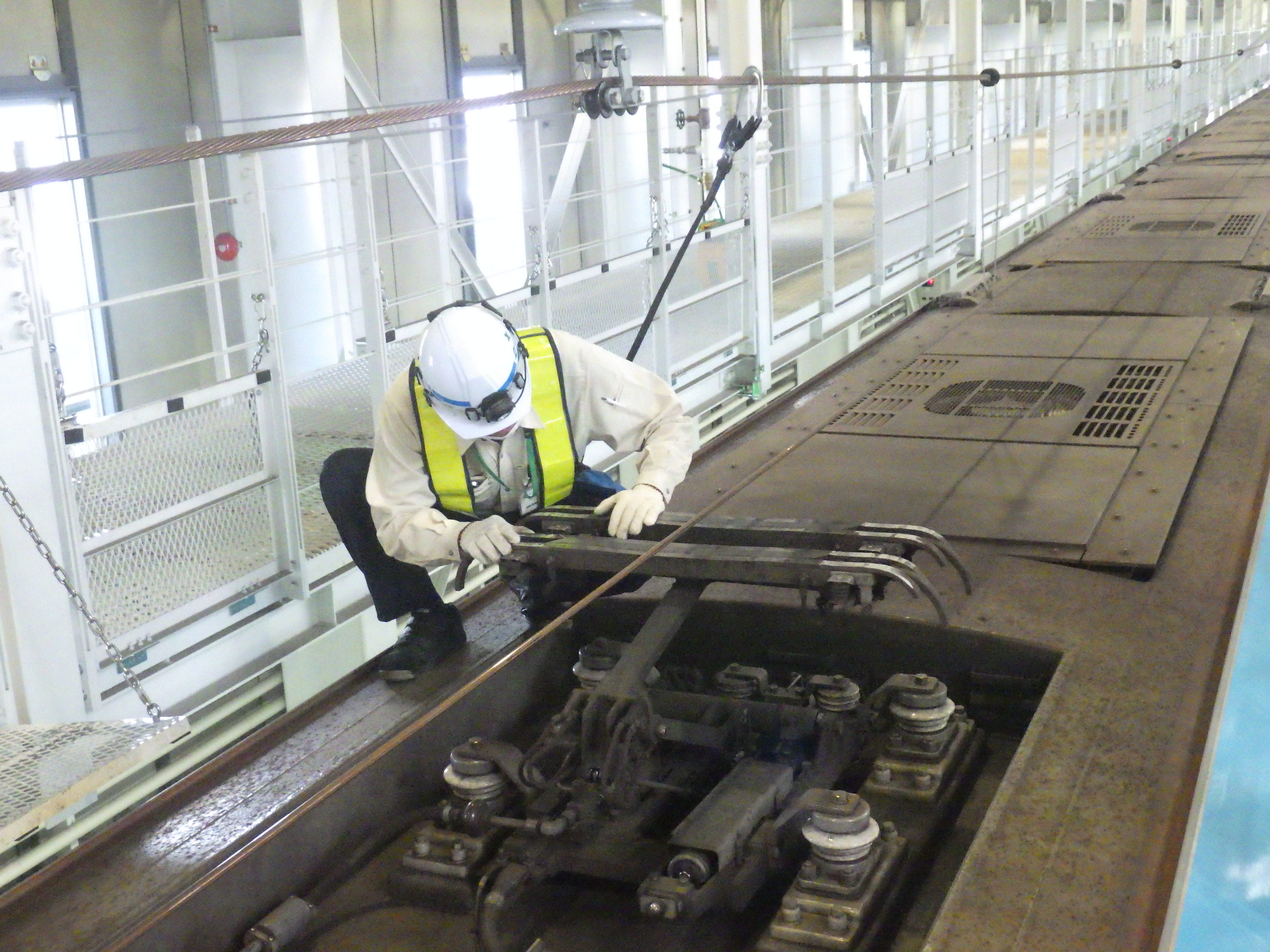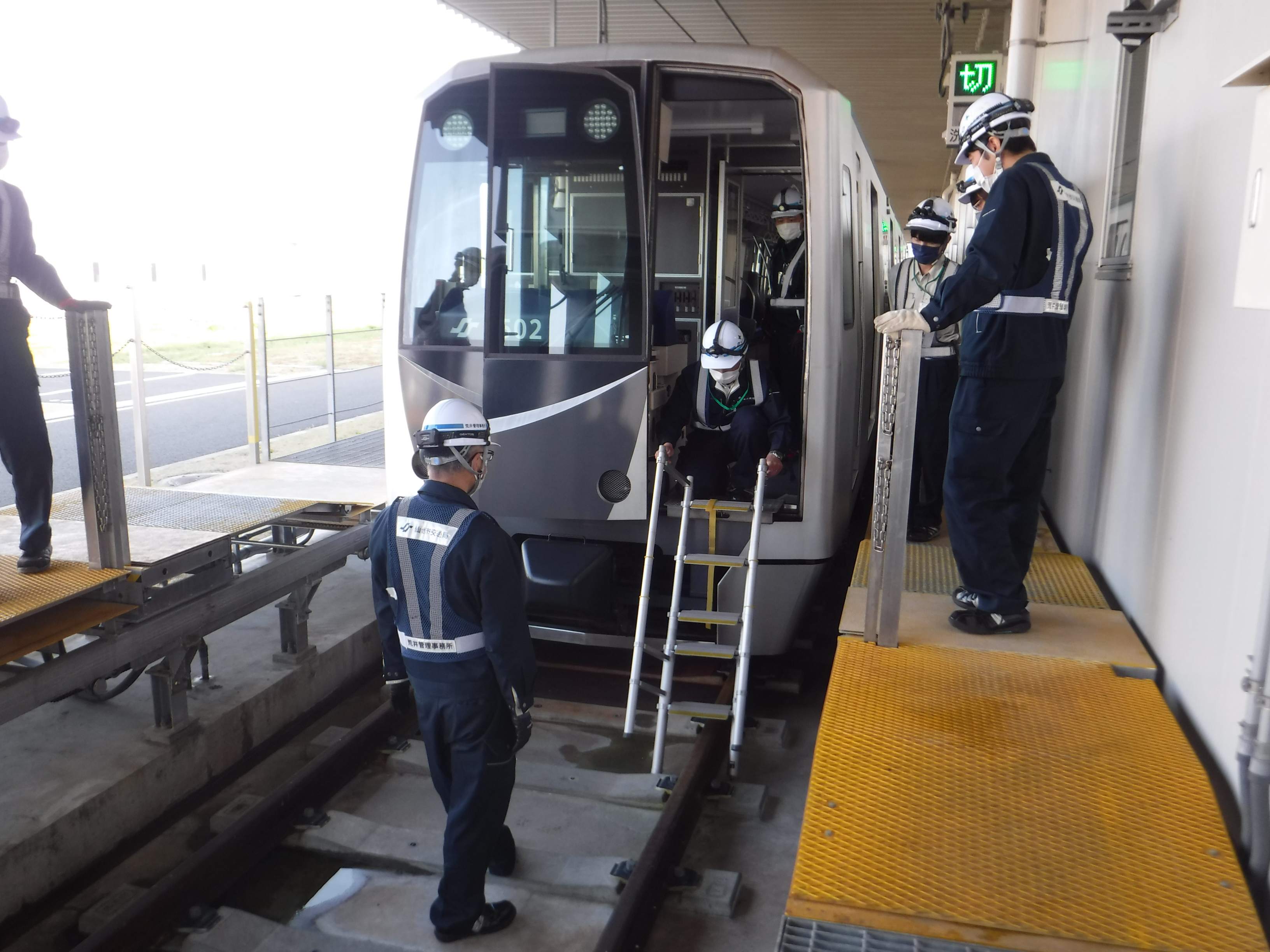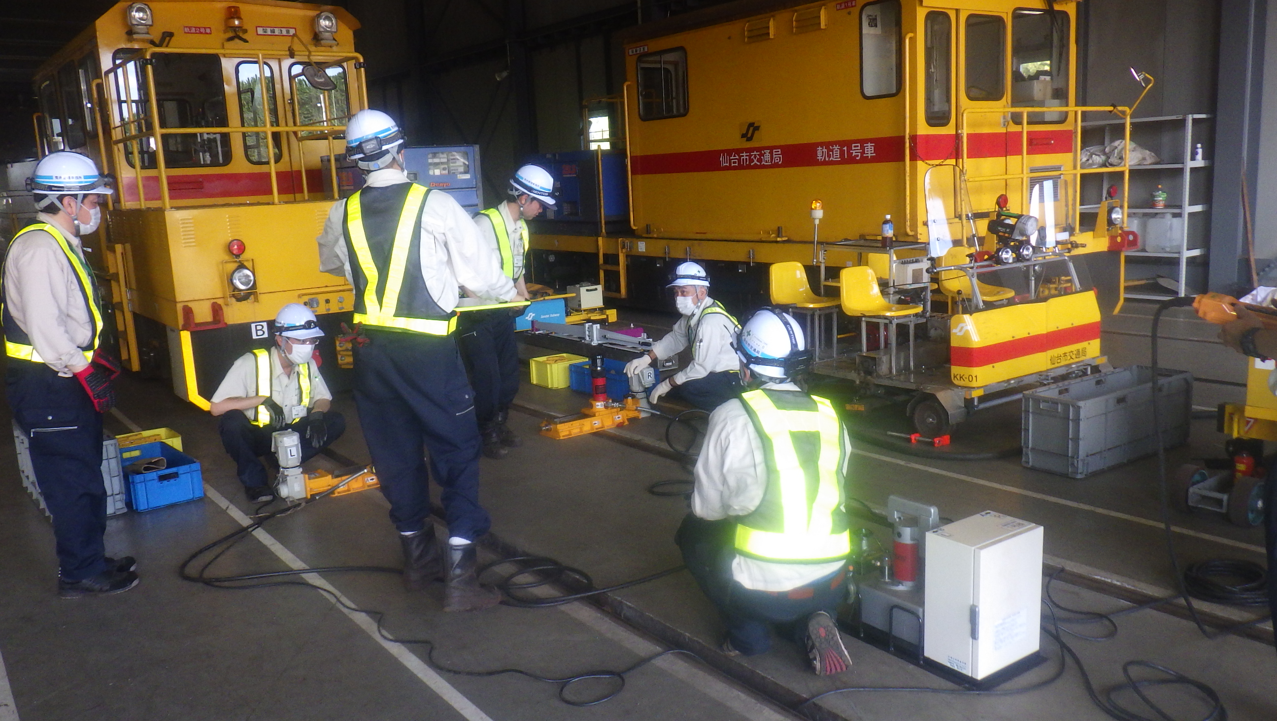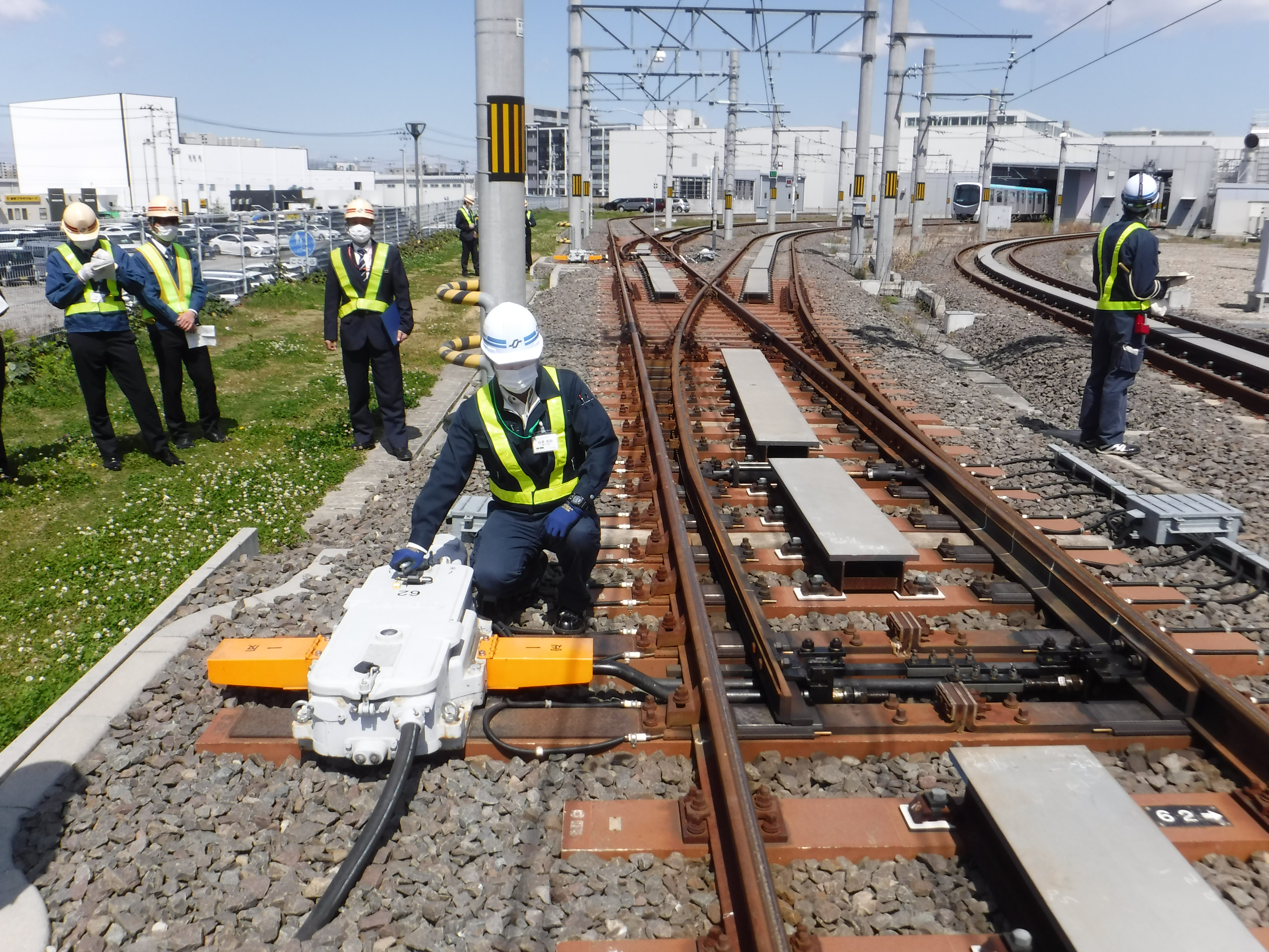 令和5年度は,車庫内での「電車線地絡(電車線の覆いが劣化などで剥けて,電気が地面に流れること)事故」を想定し,安全で迅速な対応方法の習熟に取り組みました。