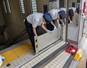駅の出入口から駅構内への雨水などの流入を防止するための止水板など設置のほか,進路構成,脱線復旧,など様々な訓練を計画的に行っています。また,保守業者や委託駅務員に対する教育の充実にも努めています。