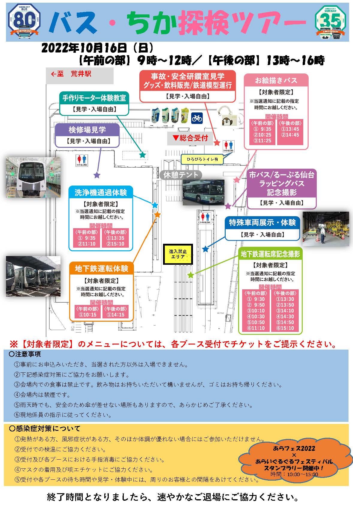 仙台市交通局では、平成29年度から荒井車両基地を一般開放する「バス・ちか祭り」を開催していますが、令和4年度は新型コロナウイルスの感染拡大防止のため、事前申込制1,000人限定で「バス・ちか探検ツアー」として開催しました。当日の開催状況の一部をお届けします。