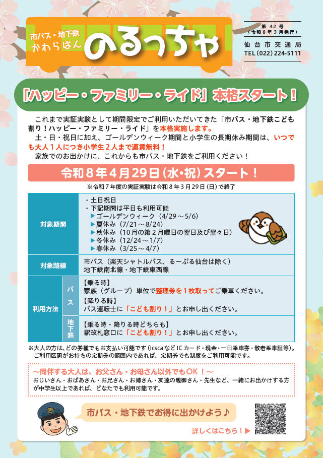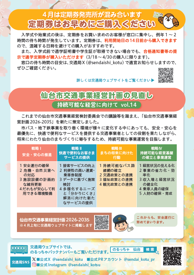 ●交通局1階乗車券発売所、地下鉄駅乗車券発売所(仙台駅、勾当台公園駅、泉中央駅、長町南駅、八木山動物公園駅、薬師堂駅、荒井駅)、旭ヶ丘バスターミナル乗車券発売所