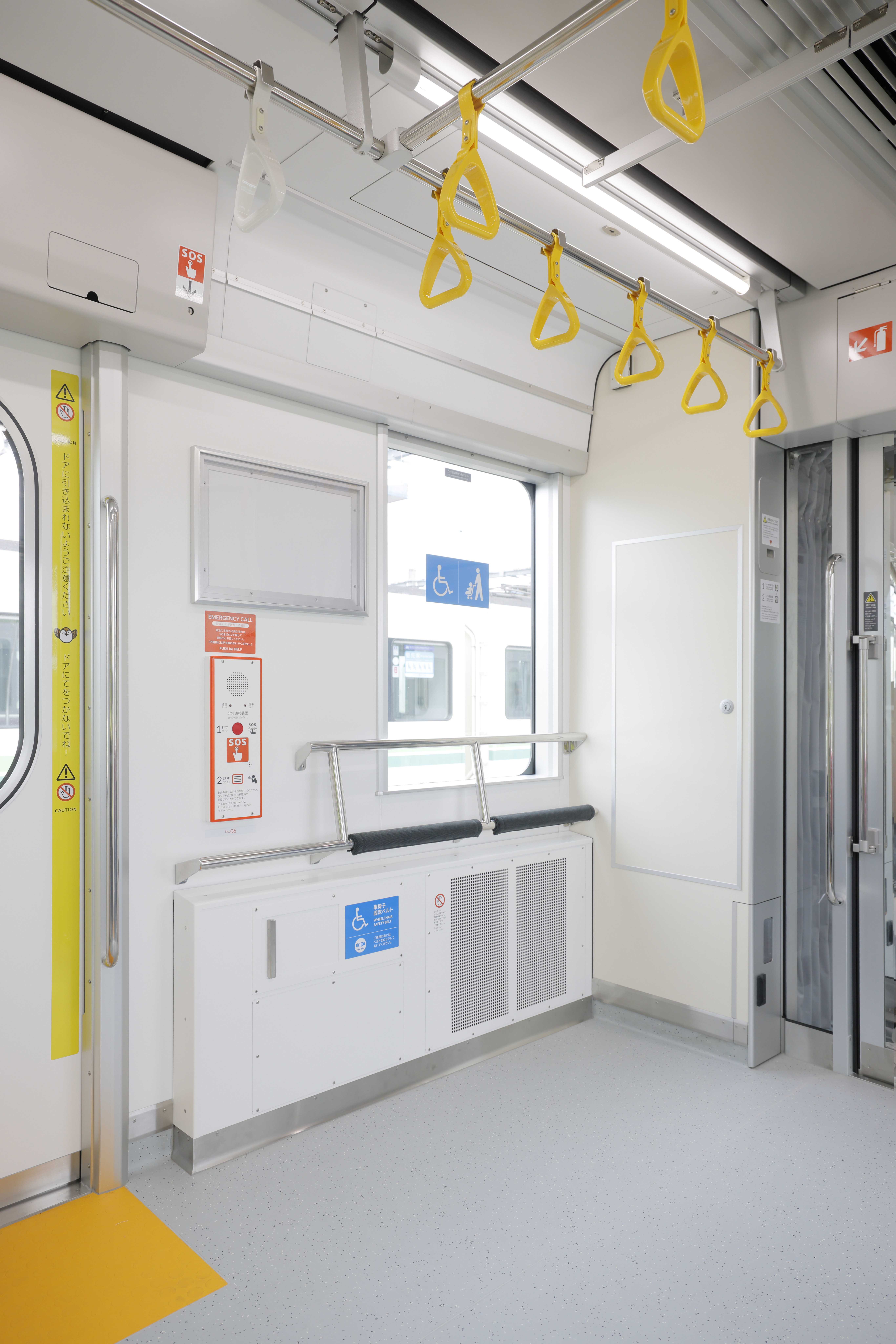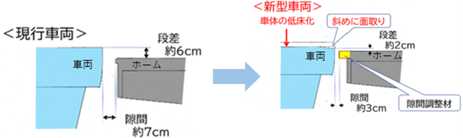 | 車両の低床化や隙間調整剤の設置からホームとの隙間幅が約7cm⇒約3cmへ縮小 |