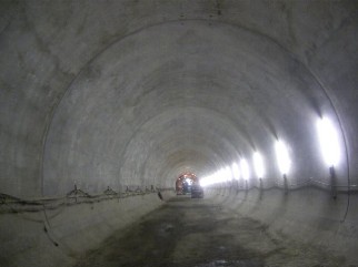 トンネルの掘削が終わり,トンネルの底面に逆アーチ型のコンクリート