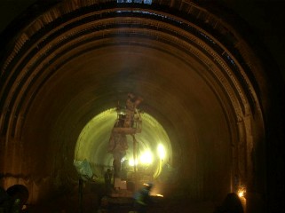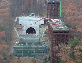 トンネル出口で,竜の口橋りょう下部工事を進めています。