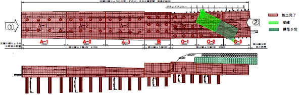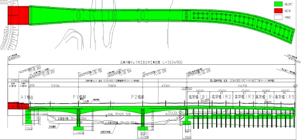 上図は、「広瀬川よう壁」「広瀬川橋りょう」「西公園高架橋」の平面図と断面図です。