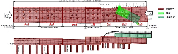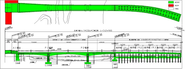 上図は、「広瀬川よう壁」「広瀬川橋りょう」「西公園高架橋」の平面図と断面図です。