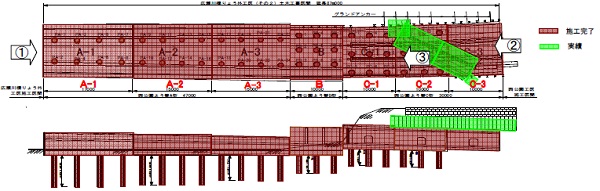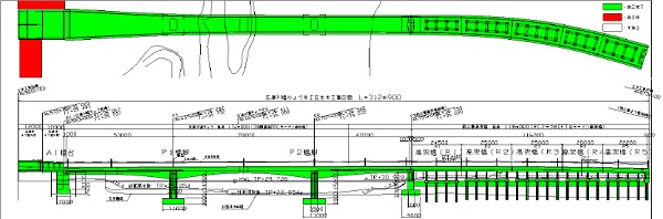 上図は、「広瀬川よう壁」「広瀬川橋りょう」「西公園高架橋」の平面図と断面図です。