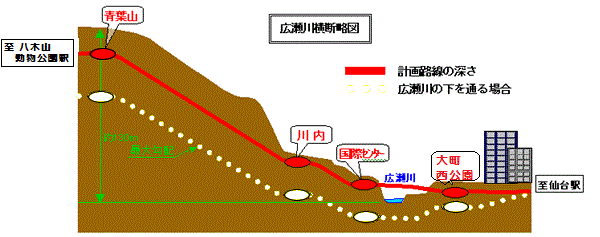 ■広瀬川は橋で渡る東西線が広瀬川を渡るには、川に橋を架けるか、または川の下を潜るしか方法はありません。広瀬川の下を通りますと、当然、川を挟んだ2つの駅は広瀬川よりも深くなります。また、広瀬川と青葉山では、約130mの高低差がありますが、電車が安全に運行できる勾配に限界がありますので、青葉山駅が極端に深い駅となり、地下鉄駅として非常に利用しにくくなってしまいます。 そこで、広瀬川に橋を架けて渡り、川内駅・国際センター駅を地表に近い位置にホームをつくることにより、青葉山駅をできるだけ浅くし、地下鉄を便利に利用できるように考えています。