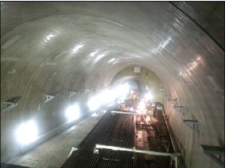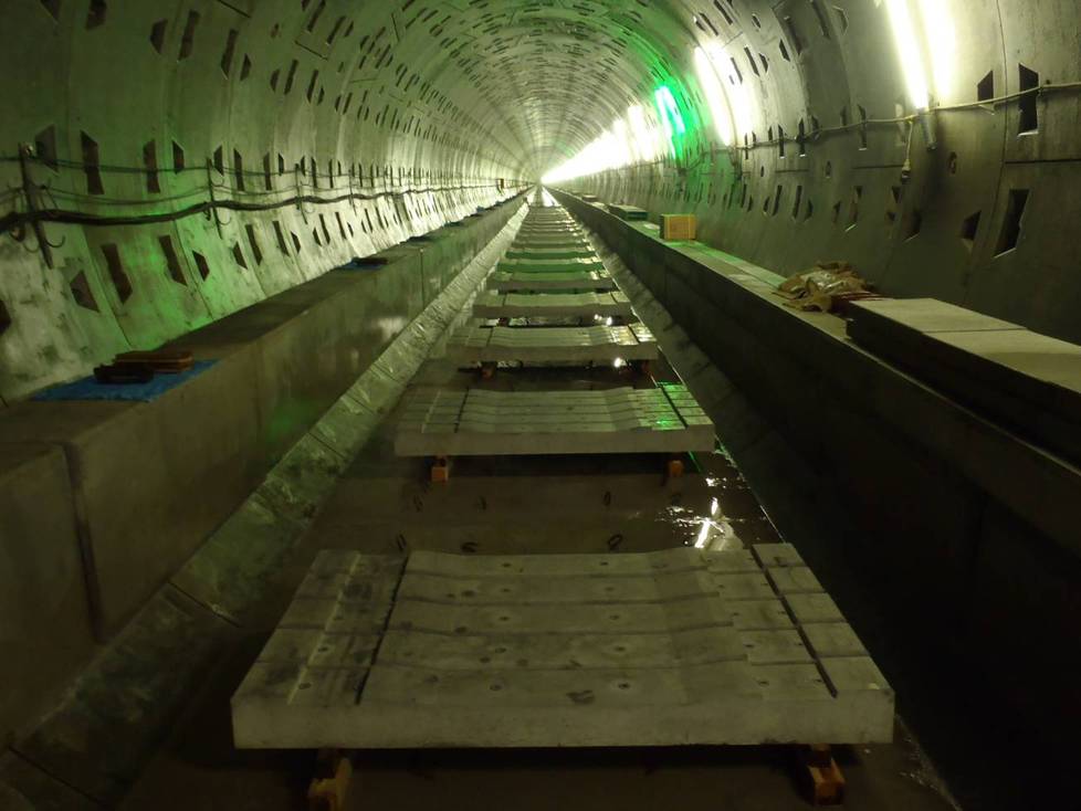 軌道工事はトンネル内にまくらぎとレールを敷き並べ金具で締結し、コンクリートで固定する作業になります。