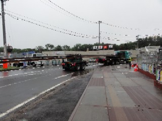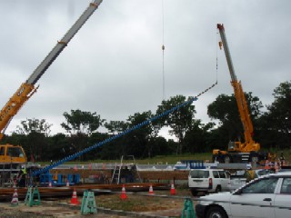 クレーン車の1台はレール投入シューターを吊り上げるのに使用され、もう1台はレールの端に取り付けられ、レールを滑り降ろす速度を調整します。