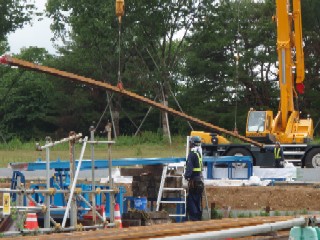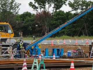 現場に運搬されたレールはクレーン車で吊るされ、レール投入シューターに移されます。