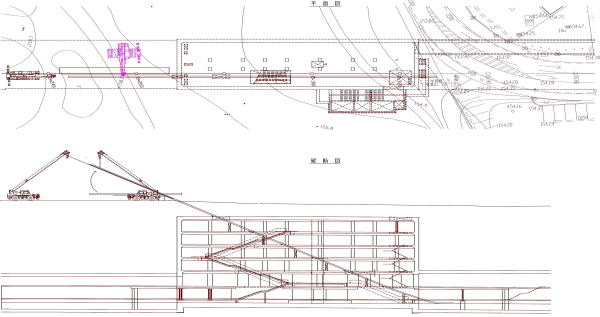ホーム階(地下6階)にレールが滑り降りてきたところです。